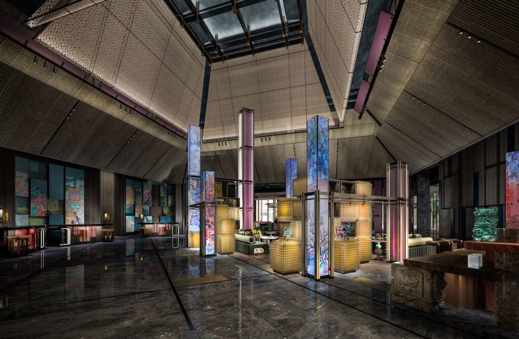新酒店的设计从宋式古韵美学与临安繁盛的商业历史文化中汲取灵感,在万丽品牌富有戏剧性美学张力的演绎下,营造出穿越古今、激发创意的文化剧场。大堂灵感源自南宋临安的水路码头,接待台形似船帆桅杆,地面拼花融入宋代纸钞及通关文牒元素,寓意古今商旅往来的繁荣图景;空间立面装饰呼应码头货物堆叠的意象,重现临安昔日商贾云集、文化交汇的生动场景。