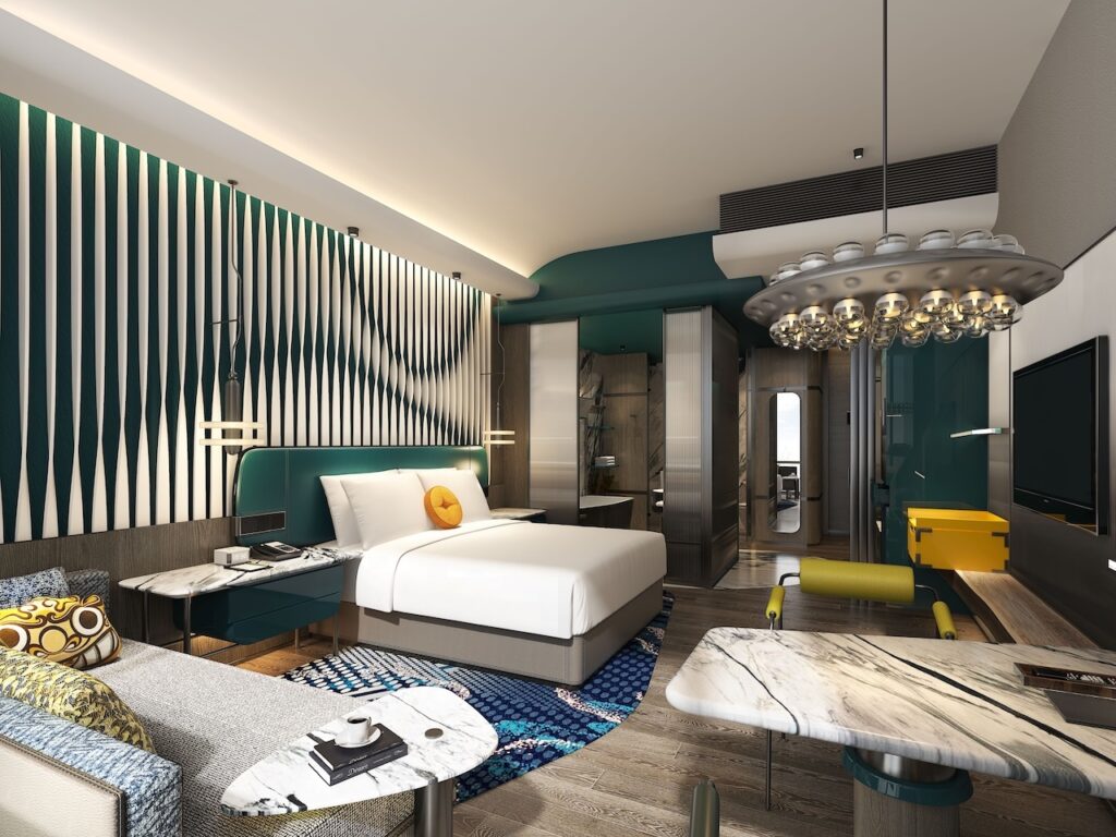 酒店拥有296间设计鲜明客房与套房,大胆的配色方案构筑出兼具视觉冲击力与艺术美感的休憩空间。每间客房均配备舒适床品、高端卫浴、高速无线网络。部分房型配备户外阳台,将狮山公园的盎然绿意尽收眼底,让宾客在静谧之中感受自然与人文的和谐交融。