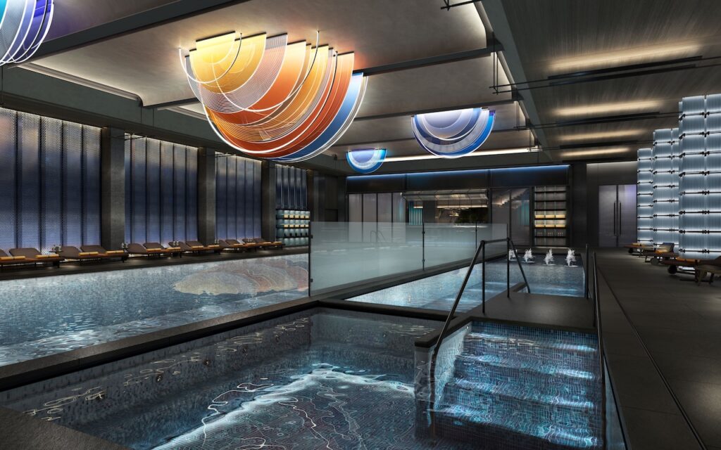 酒店还配备丰富的康体设施。24小时开放的健身房营造出“镜花水月”的空间美感,让宾客尽情享受运动带来的快乐。恒温泳池采用深浅渐变的马赛克装饰,畅游时更具视觉享受。